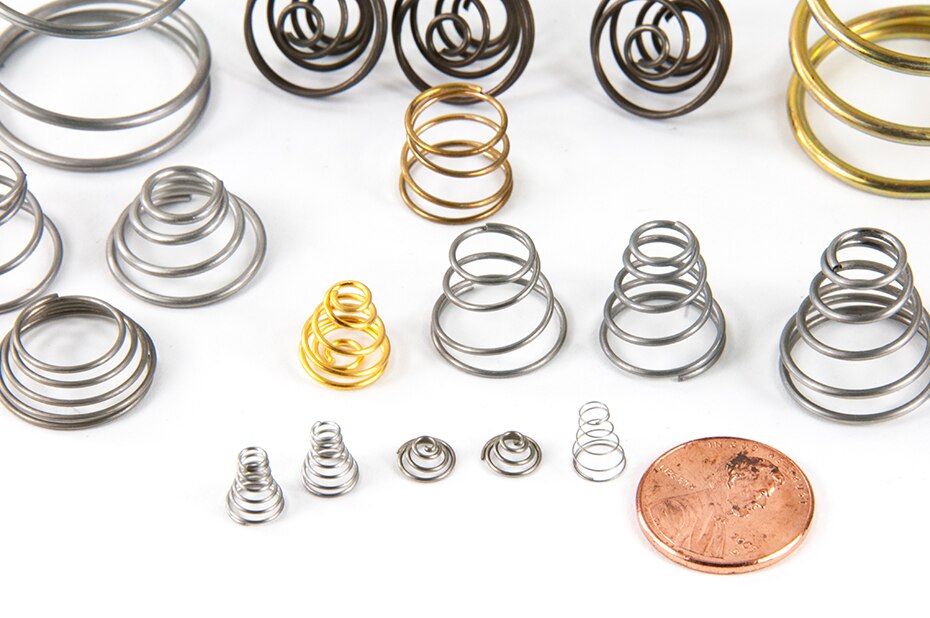 We are recognized as the foremost manufacturer and supplier of Conical Springs that are used in automotive engines, cell phones, etc. Our offered springs are made up of phosphorous bronze and high grade stainless steel such as 302, 304 and 316 that are procured from the certified vendor of the market. We offer these springs in various technical specifications and can also be custom design in order to meet the various demand of our renowned client. Features: High compression strength Corrosion resistance High working efficiency Our conical springs are cone shaped compression springs designed to provide a near constant spring rate and a solid height lower than a normal spring. Each spring features a variable pitch to achieve the constant spring rate and coils which nest during deflection to provide a solid height approximately equal to two wir Our conical springs are cone shaped compression springs designed to provide a near constant spring rate and a solid height lower than a normal spring. Each spring features a variable pitch to achieve the constant spring rate and coils which nest during deflection to provide a solid height approximately equal to two wire diameters. Some uses for conical compression springs are as follows: • Small solid height • Variable rate • Stability • Vibration